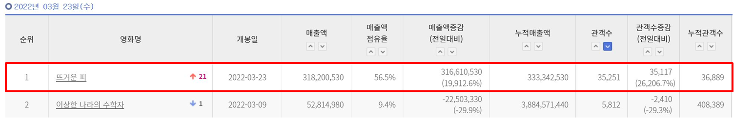 [출처: 영화관입장권 통합전산망 3월 24일(목) 오전 7시 기준]