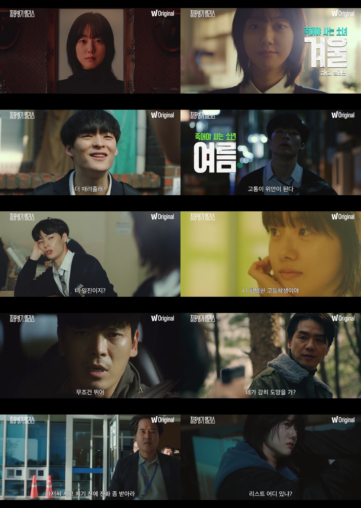 이번에 공개된 메인 예고편은 신선한 캐릭터 설정과 핑크빛과 핏빛을 오가는 다채로운 장르적 재미가 담겨있어 이목을 끈다. 먼저, 국제적인 킬러 집단 ‘컴퍼니’ 출신인 죽여야 사는 소녀 ‘겨울’(박세완)이 킬러의 세계로부터 도망쳐 평범한 고등학생 모습으로 등장해 눈길을 사로잡는다. 고통을 위안으로 삼는 죽어야 사는 소년 ‘여름’(송건희)이 위험에 처한 순간 ‘겨울’이 구해주면서 두 사람의 강렬한 첫 만남을 보여준다. 이후 같은 반 동급생으로 다시 만나게 된 둘 사이에 미묘한 핑크빛 기류가 흐르는 가운데, ‘겨울’의 뒤를 쫓던 범죄 조직의 등장으로 순식간에 분위기는 핏빛으로 물든다. 그들에게 잡히지 않기 위해 필사적으로 도주하는 ‘겨울’, ‘여름’의 숨막히는 추격전은 긴장감을 극대화하며 하드코어 요소와 강렬한 액션을 기대하게 만든다. 여기에 “네가 감히 도망을 가?”라며 광기 서린 얼굴을 한 미치광이 킬러 ‘스파이시’(김태훈)의 장면까지 더해져 더욱 손에 땀을 쥐게 만든다. 한편, 쫓기는 ‘겨울’의 숨겨진 보호자 ‘Mr. 반’과 ‘여름’을 걱정하는 형사 ‘남우’가 본격적으로 등장하며 이들을 돕기 시작한다. 이에 베테랑 배우 김성오와 정승길이 숨 막히는 열연을 펼칠 것으로 기대감을 한껏 고조시킨다. “위험한 그들이 만났다”, “우리는 살아남아야 한다”라는 카피처럼 도무지 어울릴 것 같지 않은 두 인물이 만나 예측 불허의 추격전을 펼치는 <최종병기 앨리스>는 이제껏 본 적 없는 새로운 장르로 시청자들을 찾아갈 예정이다.