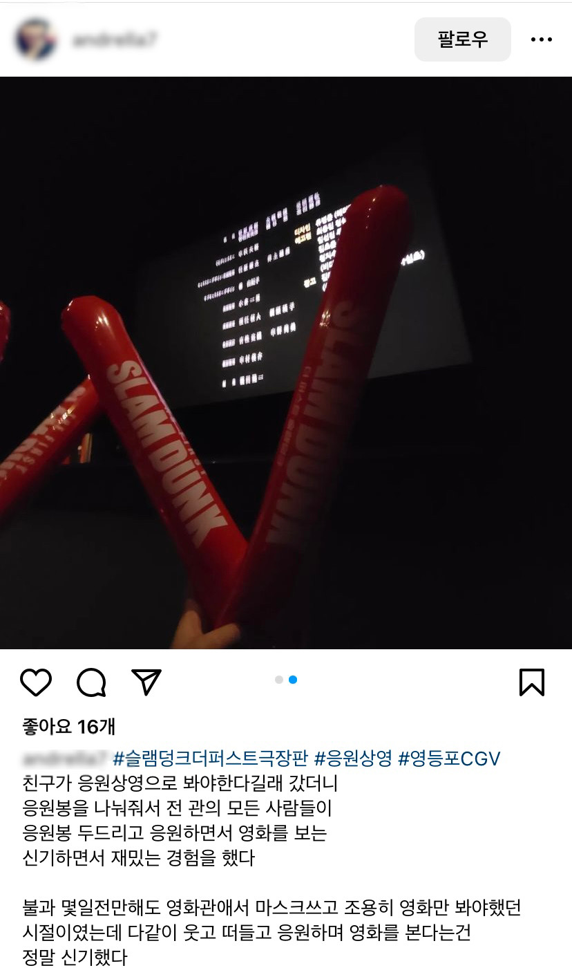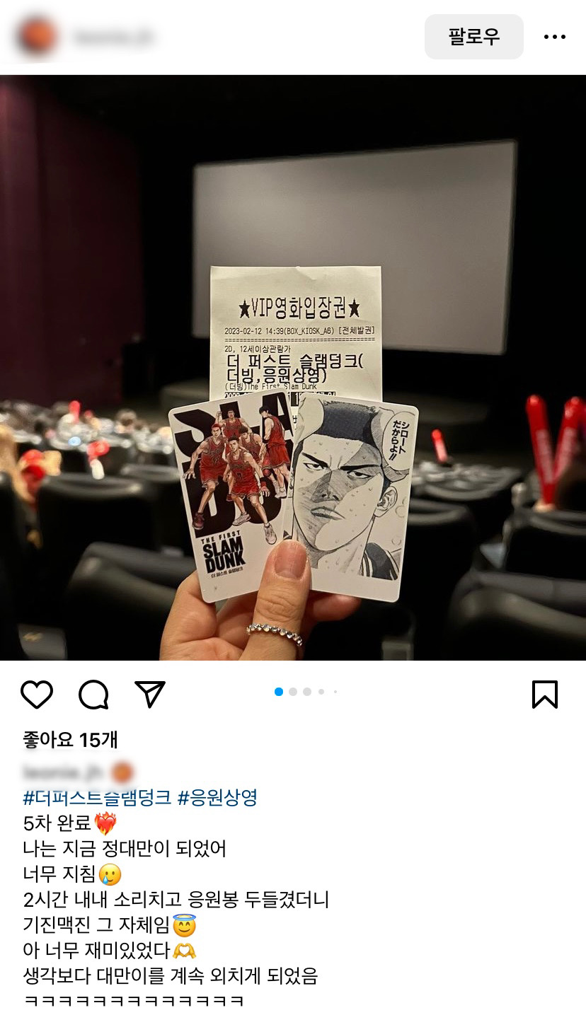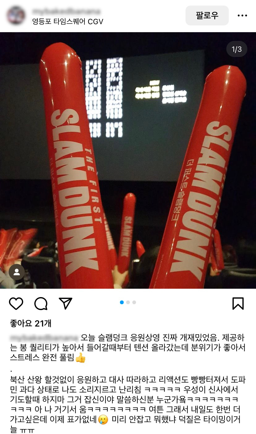 오픈 이후 단 시간에 매진을 기록한 전국 응원 상영회는 상영 이후 관객들의 후기가 SNS를 뜨겁게 달궜다. 북산고 유니폼을 착용한 관객뿐만 아니라 응원하는 선수의 플래카드와 응원 깃발을 직접 제작한 관객들까지 ‘슬친자’들이 총출동해 ‘특별 응원봉’을 흔들며 상영 내내 열띤 응원을 이어나갔다. 응원 상영회에 참석한 관객들은 “대사 따라 하고 리액션도 빵빵 터져서 도파민 과다 상태로 소리 지르고 난리 침”(인스타그램 @my**), “다 같이 경기보는 기분”(인스타그램 @st**), “뭔가 신기했다 콘서트 온 느낌”(트위터 @ko**), “응원하면서 진심 업무 스트레스 싹 내려감. 주말마다 열어주세요”(트위터 응*), “북산, 산왕 합동 콘서트에 다녀온 듯하다”(트위터 이*), “산왕과 북산을 서로 응원한다는 것 자체가 꿈만 같았어”(트위터 루*) 등 생생한 후기들을 남기며 뜨거웠던 현장에 대한 여운을 드러냈다.