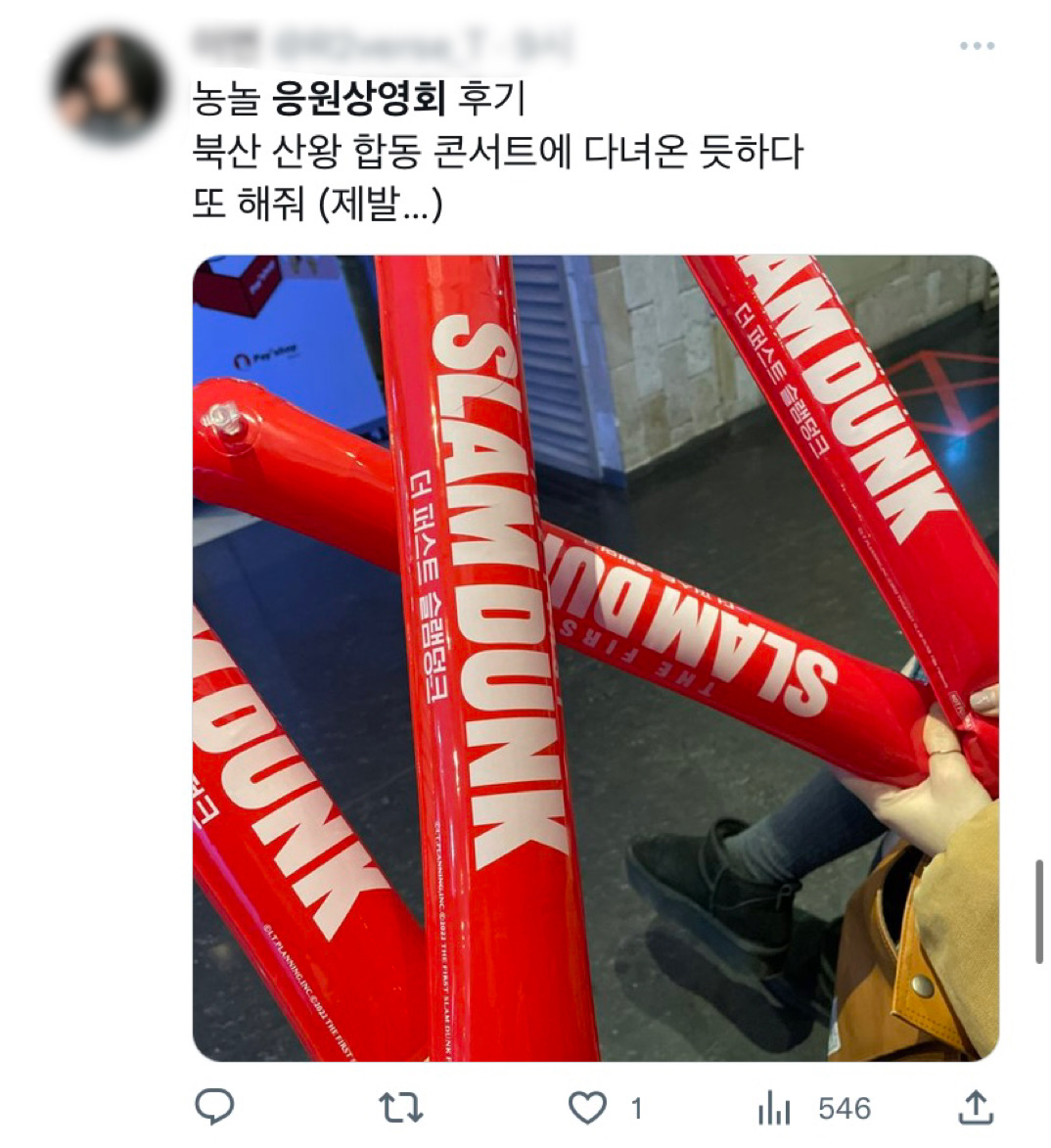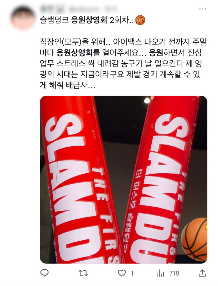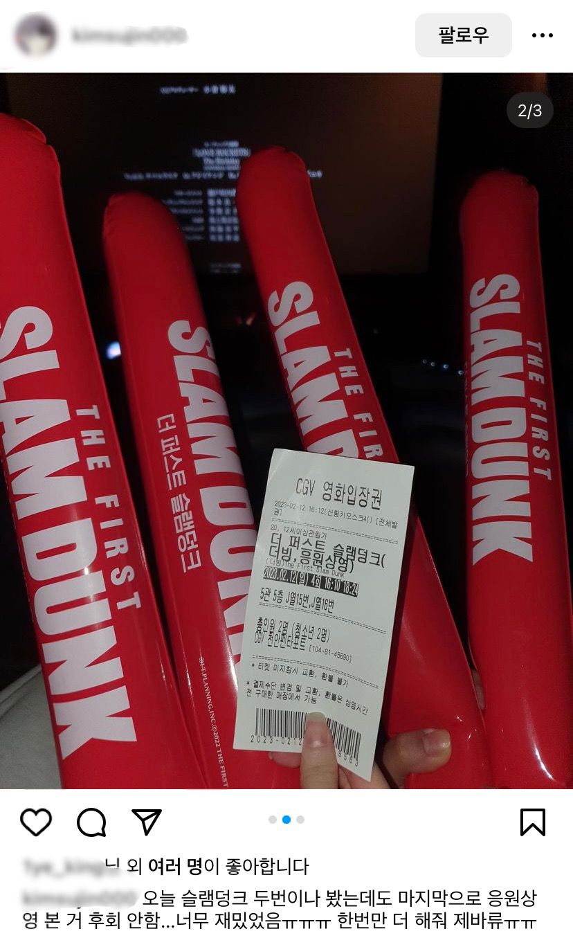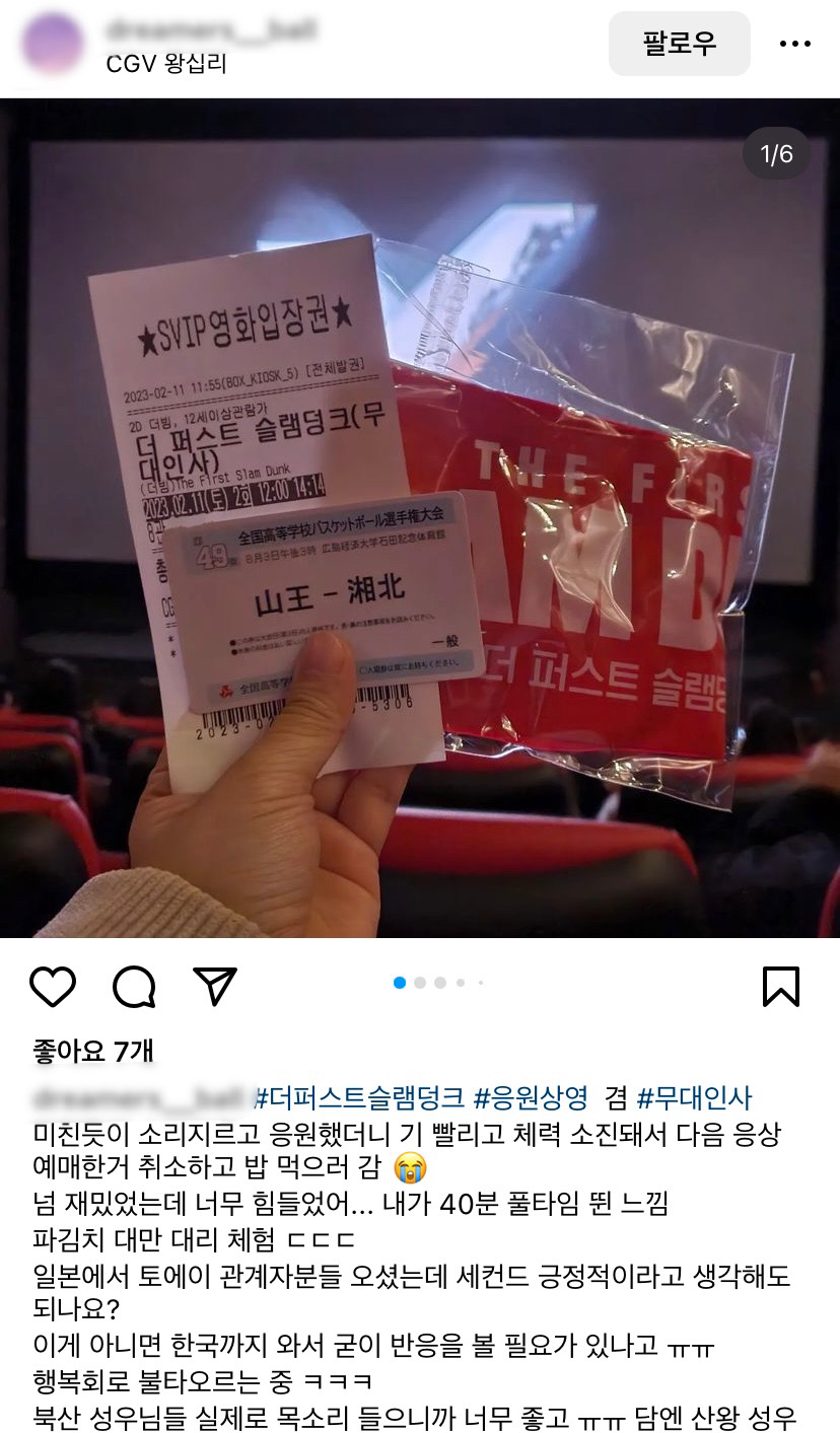 오픈 이후 단 시간에 매진을 기록한 전국 응원 상영회는 상영 이후 관객들의 후기가 SNS를 뜨겁게 달궜다. 북산고 유니폼을 착용한 관객뿐만 아니라 응원하는 선수의 플래카드와 응원 깃발을 직접 제작한 관객들까지 ‘슬친자’들이 총출동해 ‘특별 응원봉’을 흔들며 상영 내내 열띤 응원을 이어나갔다. 응원 상영회에 참석한 관객들은 “대사 따라 하고 리액션도 빵빵 터져서 도파민 과다 상태로 소리 지르고 난리 침”(인스타그램 @my**), “다 같이 경기보는 기분”(인스타그램 @st**), “뭔가 신기했다 콘서트 온 느낌”(트위터 @ko**), “응원하면서 진심 업무 스트레스 싹 내려감. 주말마다 열어주세요”(트위터 응*), “북산, 산왕 합동 콘서트에 다녀온 듯하다”(트위터 이*), “산왕과 북산을 서로 응원한다는 것 자체가 꿈만 같았어”(트위터 루*) 등 생생한 후기들을 남기며 뜨거웠던 현장에 대한 여운을 드러냈다.