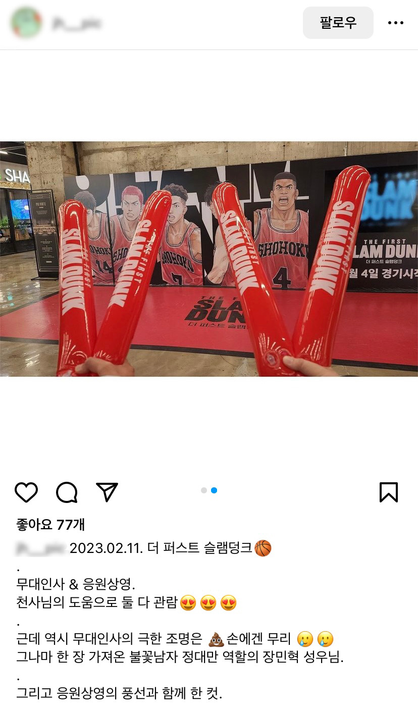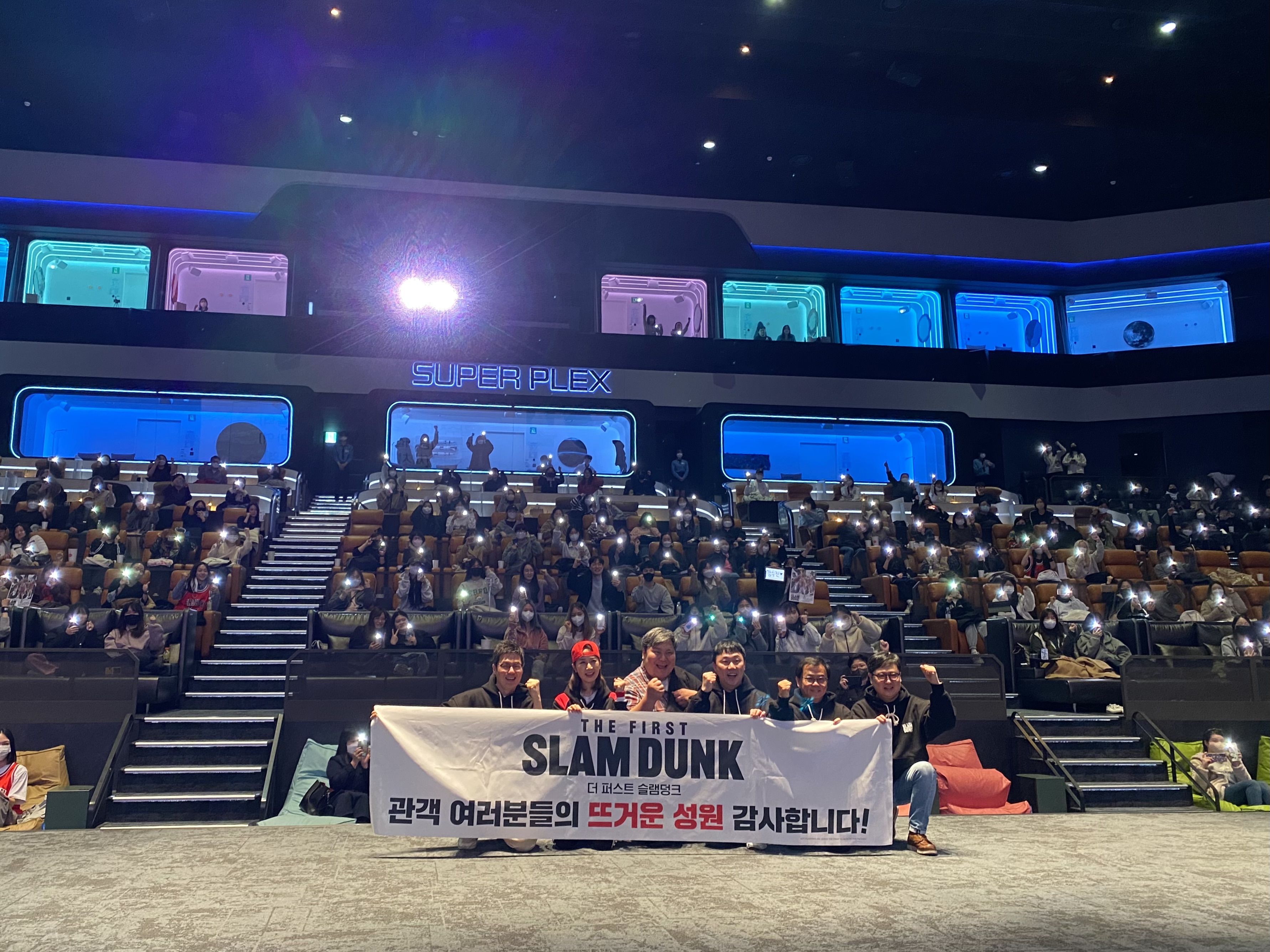 지난 2월 11일(토)에 CGV 왕십리, 롯데시네마 월드타워, 메가박스 코엑스에서 진행된 성우 무대인사 역시 관객들의 뜨거운 열기 속에서 진행됐다. <더 퍼스트 슬램덩크>의 주역들을 직접 만나기 위해 객석을 가득 메운 관객들은 성우들을 향한 플래카드까지 직접 제작해오는 등 ‘슬친자’의 면모를 보였다. 관객들의 뜨거운 성원에 보답하기 위해 성우들의 친필 사인이 들어간 포스터를 증정하는 특별 이벤트까지 진행되었다. 성우들은 각 캐릭터의 명대사로 관객들에게 인사를 건네며 “우리의 영광의 순간은 바로 지금이다”<더 퍼스트 슬램덩크>가 어디까지 가는지 지켜봐 달라”라며 남다른 소감과 함께 감사한 마음을 전했다.